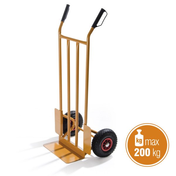 Carrello portatutto in metallo verniciato. Portata 200 kg. Ruote pneumatiche. Tubolare di grande diametro per una maggiore robustezza. Manopole in gomma con paracolpi. Dimensioni: 110x57x48 cm.