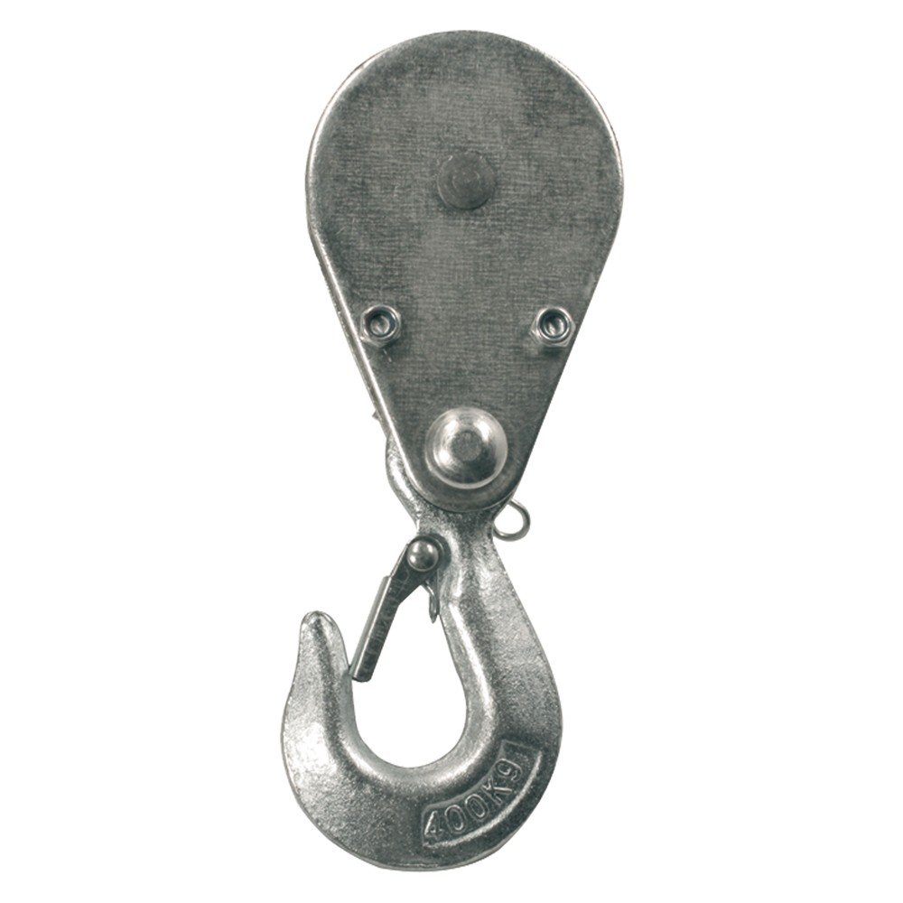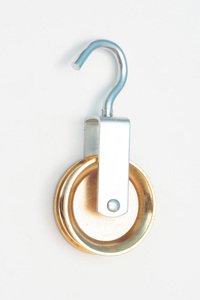 Con gancio girevole. In acciaio tropicalizzato e ruota in ferro ottonato.