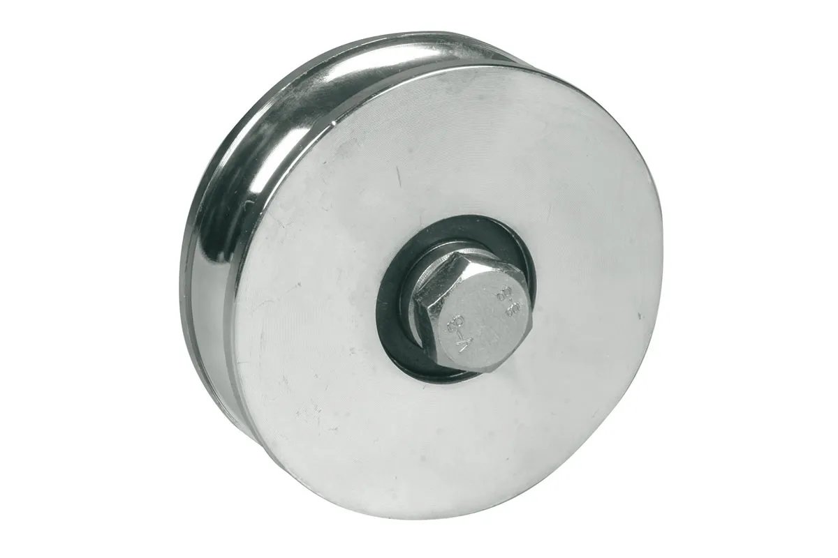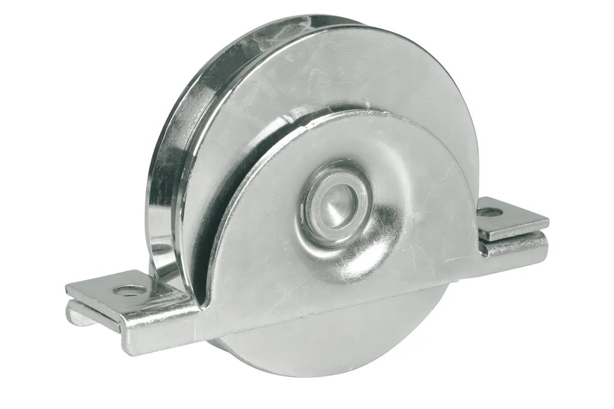 Ruota per cancelli con due cuscinetti a sfera e gola a "V". Finitura in acciaio zincato.