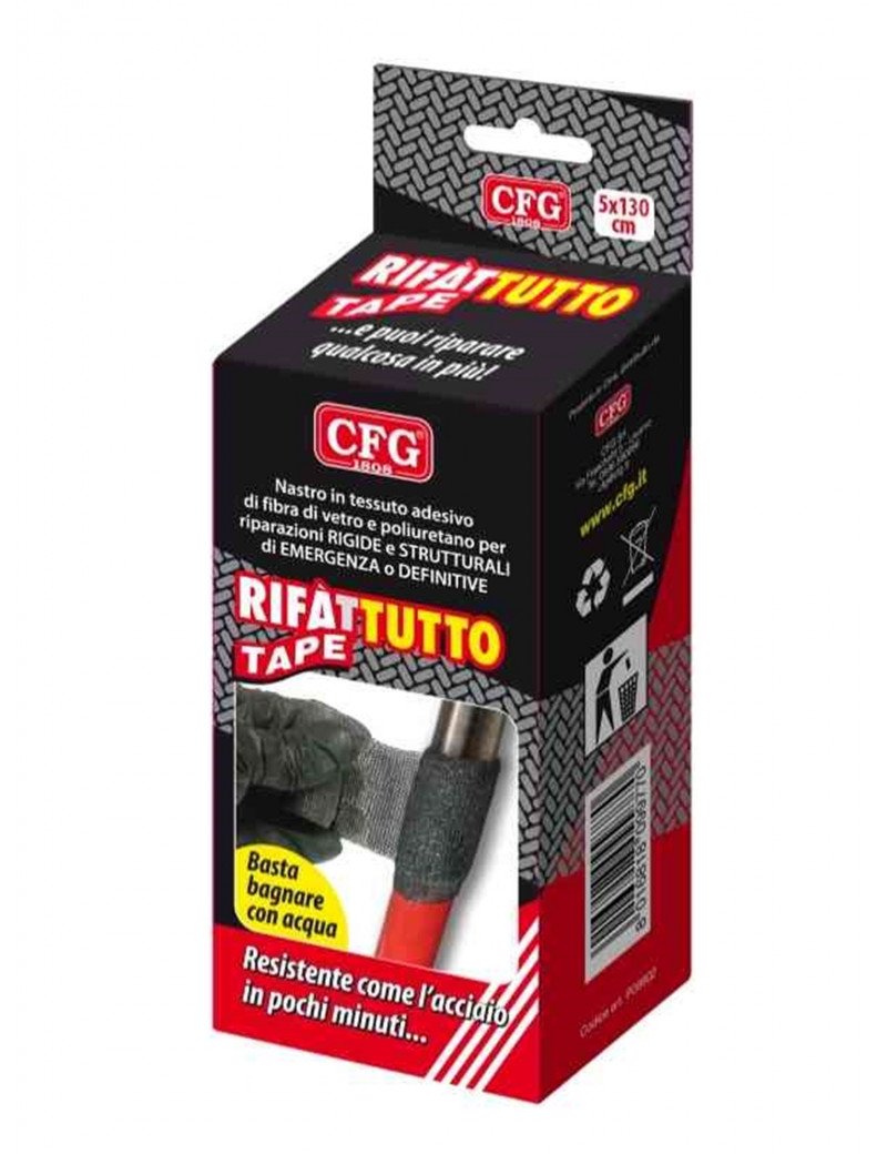 Nastro di tessuto di fibra di vetro e poliuretano adesivo, per riparazioni rigide e strutturali di emergenza o definitive. Aderisce e si incolla su qualsiasi materiale: metalli, ghisa, legno, vetro, pietra, marmo, plastica, gomma, ceramica, PVC, polyester ... (Segue)