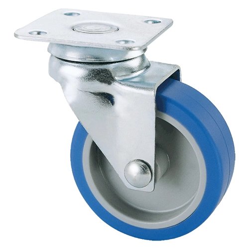 In gomma sintetica blu (durezza 97 ShA), flangiata in termoplastico, con supporto in acciaio stampato zinco-cromato. Supporto rotante a piastra su doppia corona di sfere.
