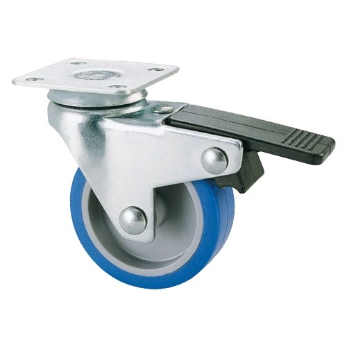 In gomma sintetica blu (durezza 97 ShA), flangiata in termoplastico, con supporto in acciaio stampato zinco-cromato. Supporto rotante a piastra su doppia corona di sfere. Dispositivo di bloccaggio ruota.