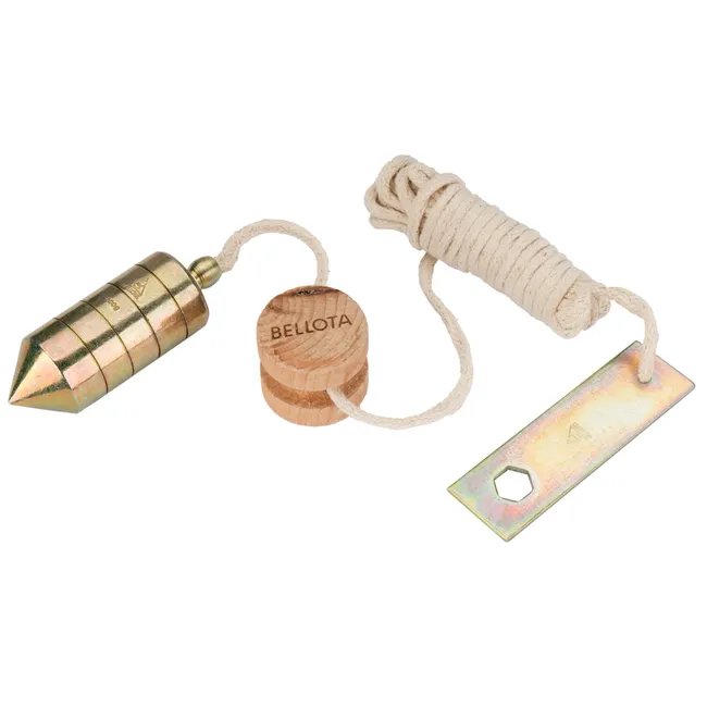 Completo di cordino da 5 metri, piastra in acciaio e disco in legno. Strumento specifico per controllare ed allineare elementi verticali in lavorazioni quali pareti, pilastri, muri.
