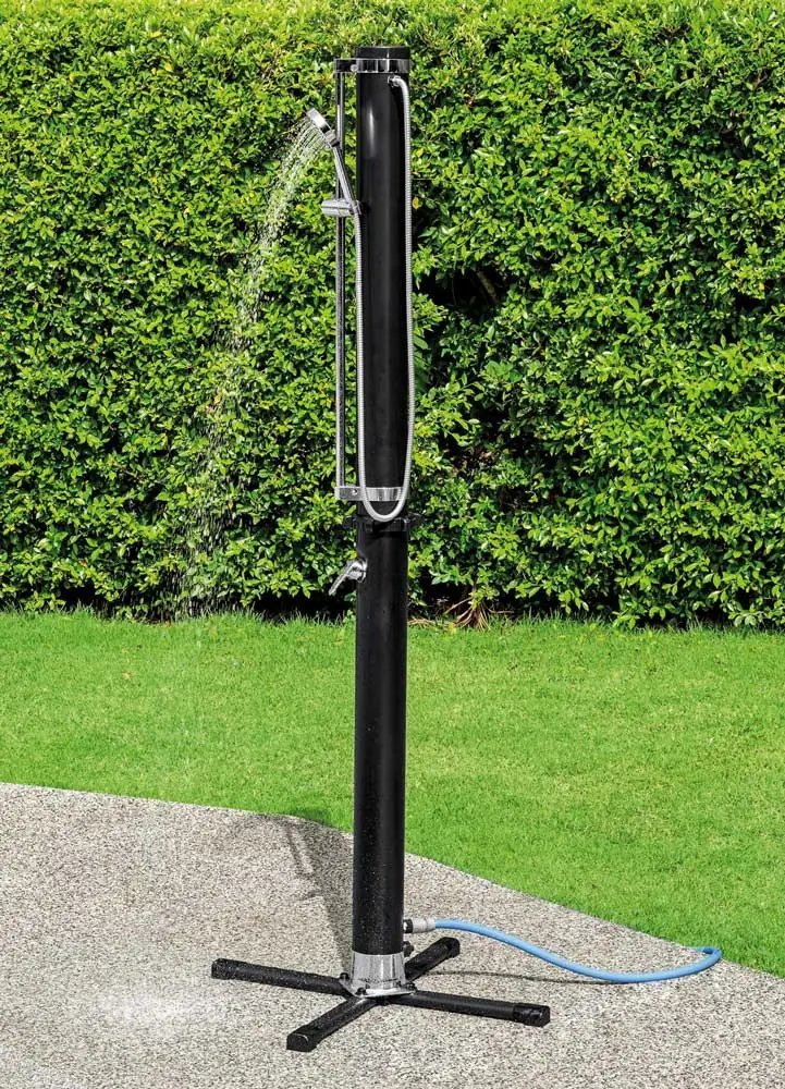 Con miscelatore, doccino regolabile e portaoggetti, riscaldamento acqua con raggi solari. Capacità serbatoio acqua calda: lt.20. Dimensione: cm. 60x60x218h