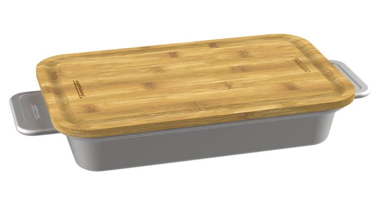 Una pirofila in acciaio inox con tagliere in bambù, che costituisce la base dell'esclusivo sistema di cottura e grigliatura intercambiabile Fornetto, per uso interno ed esterno.