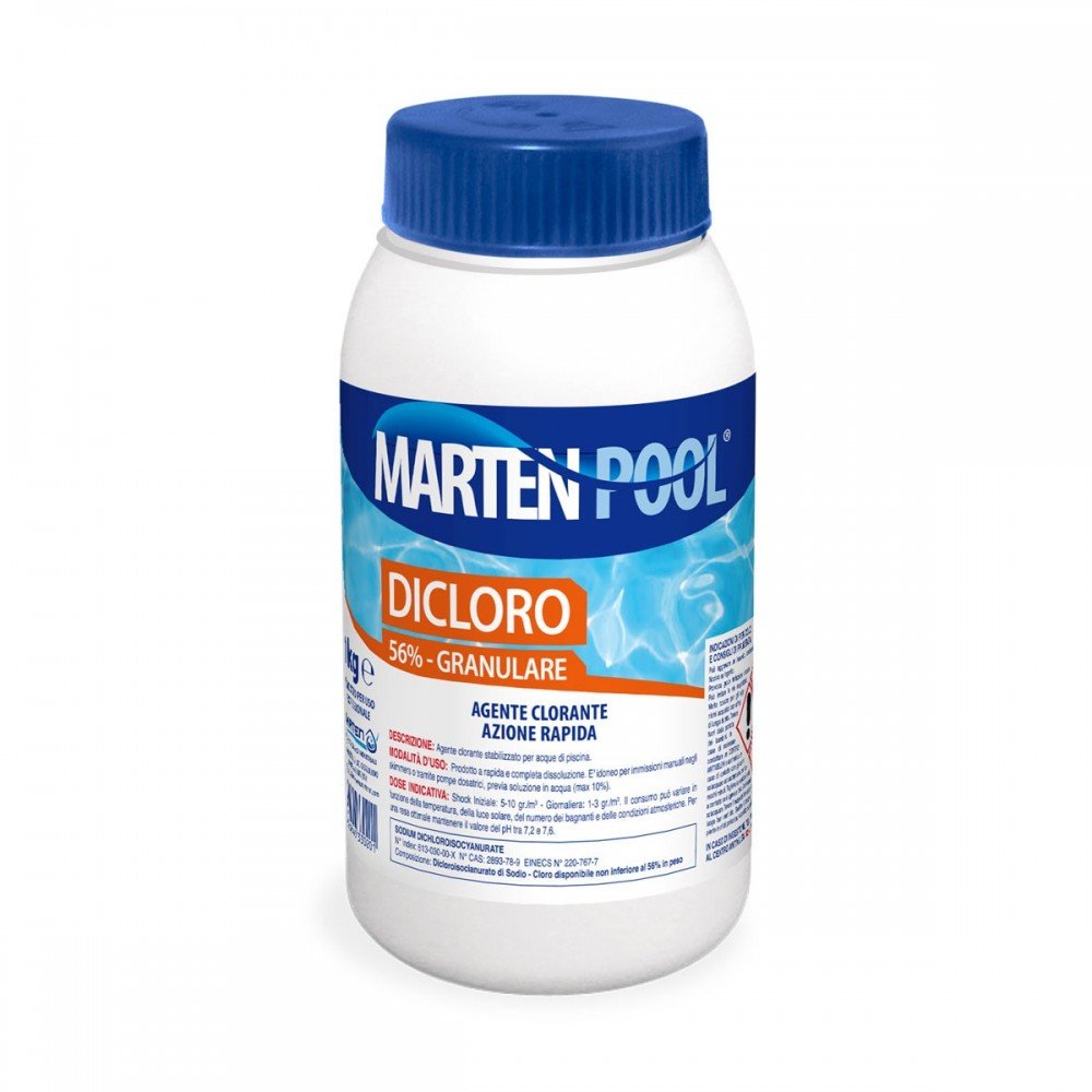 Dicloro granulare è un agente clorante stabilizzato per acque di piscina. MODALITA’ D’USO: Dicloro granulare è un prodotto a rapida e completa dissoluzione. E’ idoneo per immissioni manuali negli skimmers o tramite pompe dosatrici, previa soluzion ... (Segue)