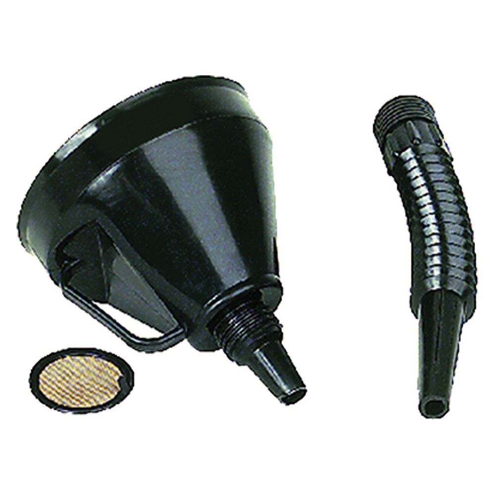 In materiale plastico adatto al travaso di oli e combustibili. Filtro rimovibile in ottone.