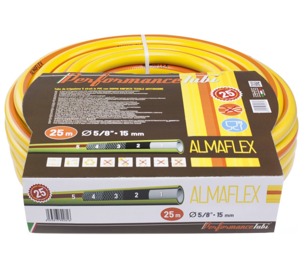 L’Almaflex è un tubo da irrigazione robusto ed estremamente flessibile. Adatto per un uso domestico e professionale. La sua struttura a 5 strati con doppio rinforzo tessile lo rende incredibilmente maneggevole ed estremamente resistente alle pieghe ed ... (Segue)