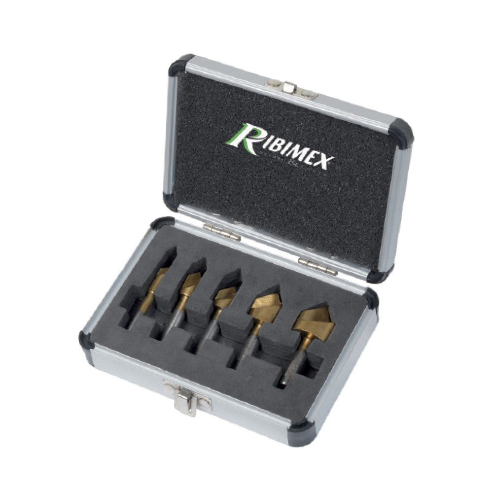 Realizzate in acciaio Hss placcate in titanio. Angolo di testa 90°, adatte per smussare o realizzare impressione di una testa della vite. Utilizzabili su trapano, ideali per lavorare su legno, plastica, alluminio. In cassetta alluminio. Intaglio ø mm 6x60 ... (Segue)