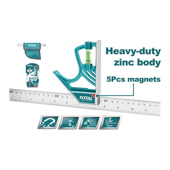 Lunghezza :300mm Larghezza: 25mm Spessore: 2.0mm Peso: 355g Blocco magnetico per la regolazione Struttura in Zinco Lama in Acciaio Stainless Include 1 tracciatore in acciaio