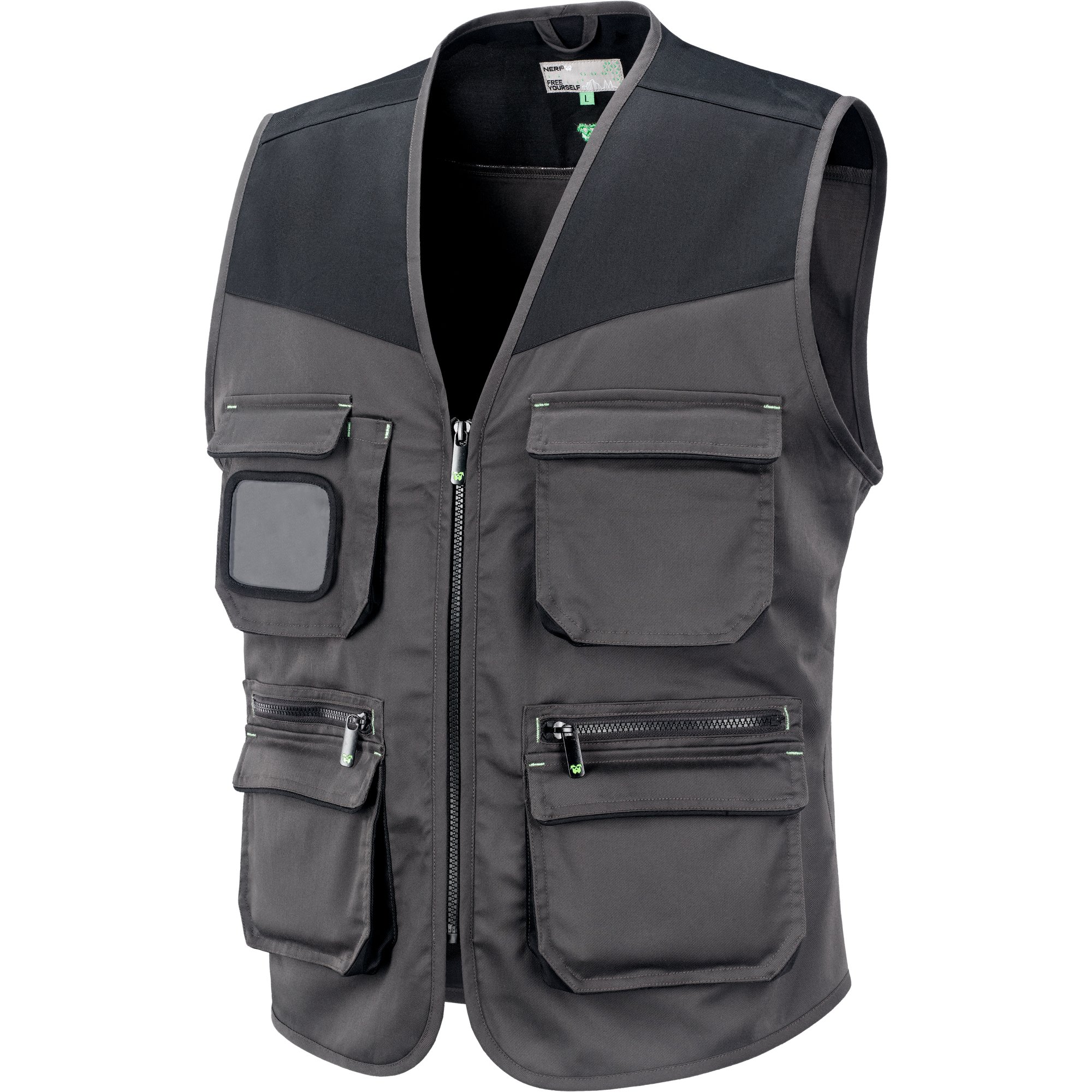 Specifiche Peso tessuto 220 g/m2 dettagli verdi a contrasto sulle tasche Tessuto nero a contrasto nelle spalle, nei soffietti e nel carré 2 tasche aperte in vita, una con patta e chiusura a strappo, una con zip 2 tasche frontali al pet ... (Segue)