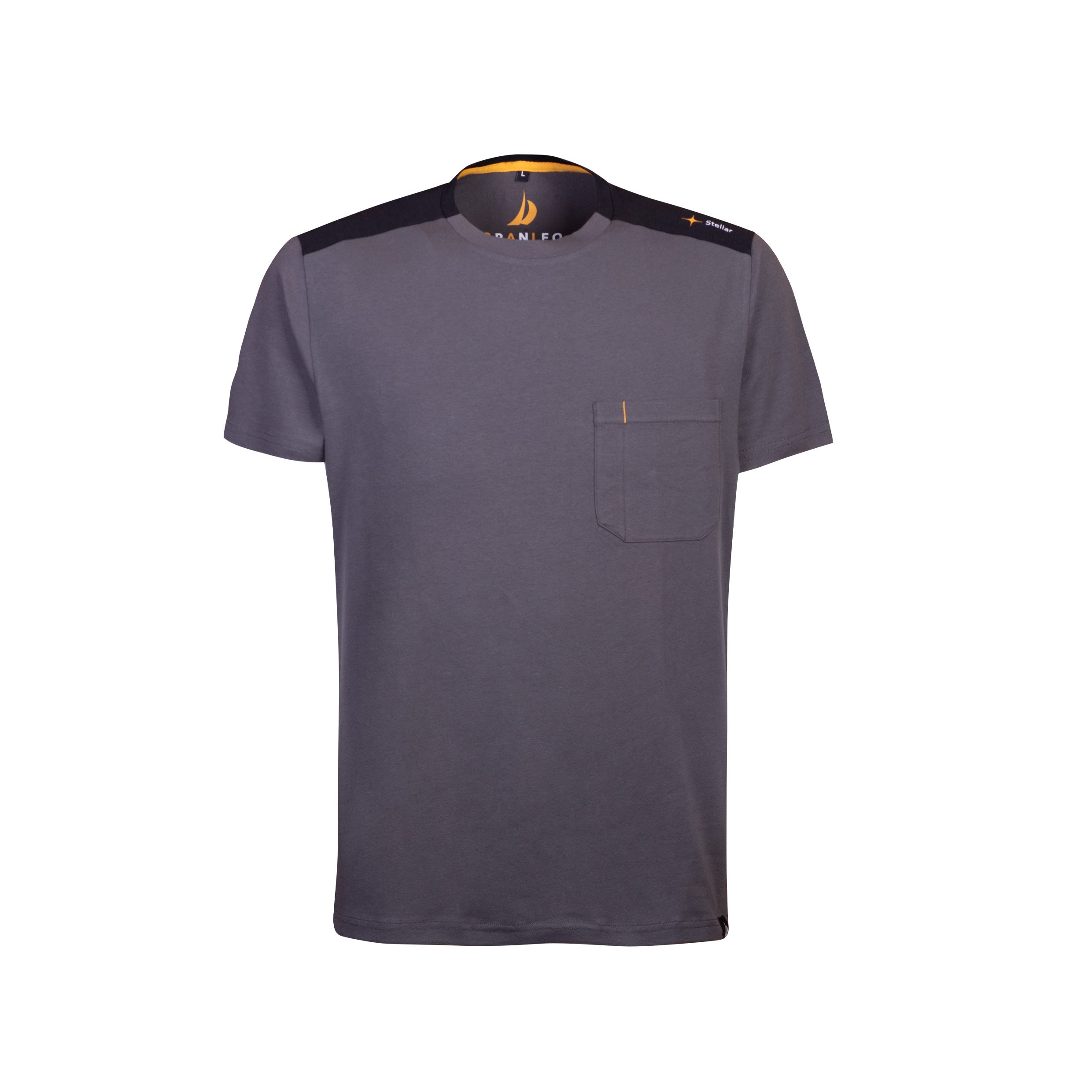T-Shirt manica corta girocollo con costina elasticizzata e para-sudore a contrasto arancio. Spalloni neri e inserti rifrangenti sul dorso. Taschino lato cuore con cucitura porta penna e travetta arancio. Composizione 95% Cotone – 5% Elastan