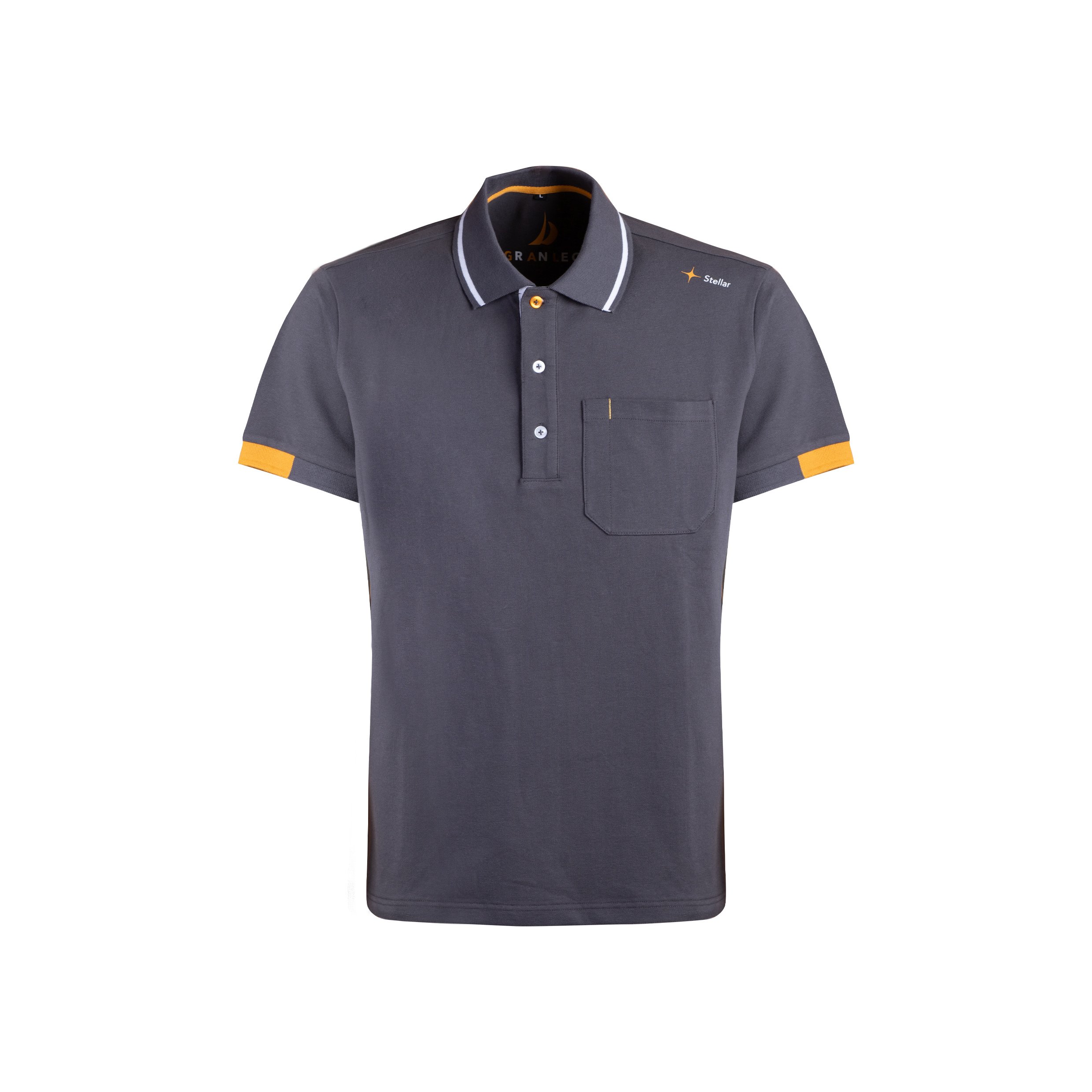 Polo manica corta girocollo con costina elasticizzata e para-sudore a contrasto arancio. Taschino lato cuore con cucitura porta penna e travetta arancio.. Composizione 95% Cotone – 5% Elastan