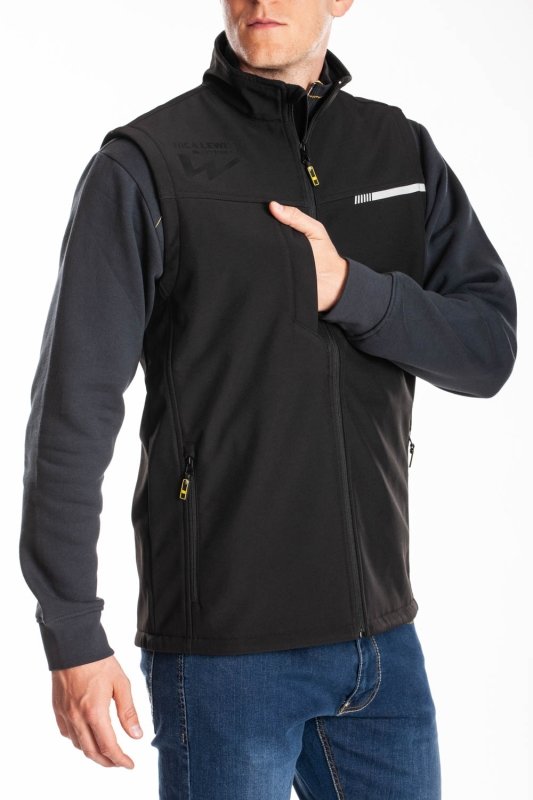 Gilet softshell basico, collo in piedi, apertura zip rovescia, vestibilita' regolare. 2 tasche con zip rovesce al fianco e tasca telefono a filetto al petto. dettaglio stampa reflex a motivo su taglio petto. tessuto a 3 strati, 300 gr, impermeabile 5000/ ... (Segue)