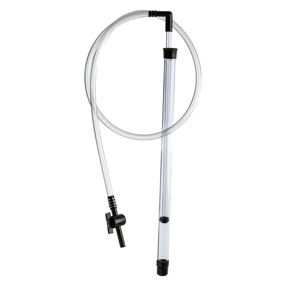 Sifone automatico realizzato in plastica alimentare, completo di tubo da 1,5 mt e Ø 8 mm. Dotato di anti-sedimento smontabile e valvola di non ritorno. Con rubinetto a farfalla.