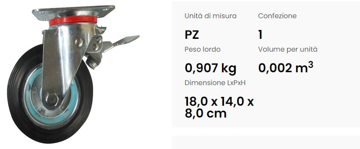 Nome:  RUOTA INDUSTRIALE D.100MM CON PIASTRA GIREVOLE (100X80MM) CON FRENO PESO MAX 70KG