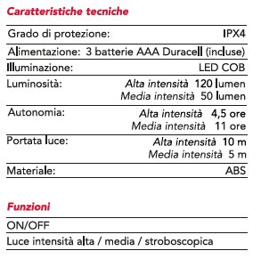 Funzioni: ON/OFF, luce intensità alta / media / stroboscopica