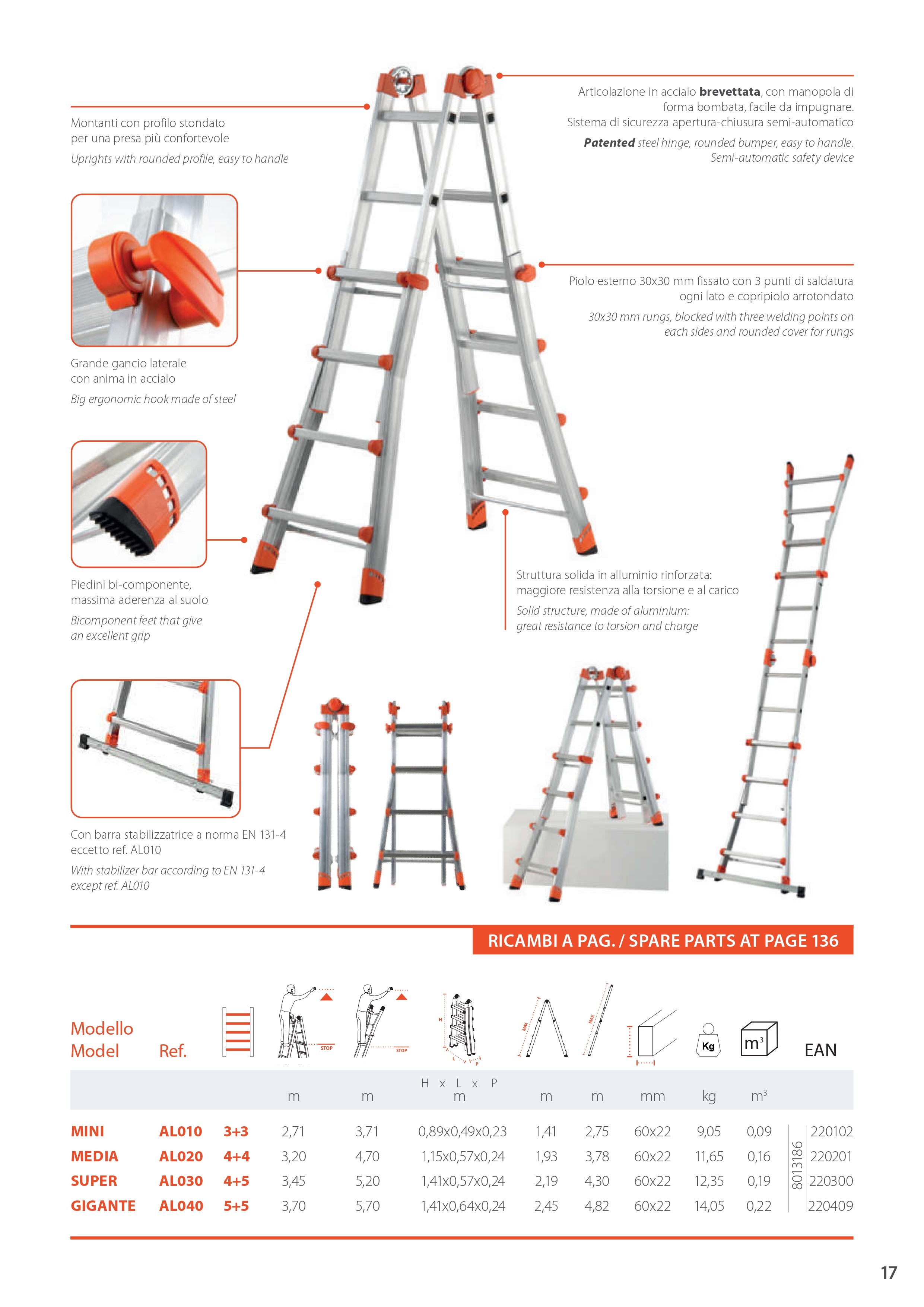 Struttura solida in alluminio. Articolazione in acciaio brevettata, piolo esterno 30x30 mm, fissato con tre punti di saldatura. Sezione montanti 60x22 mm. Portata garantita 150 kg (D.Lgs 81/08). Prodotto Made in Italy.