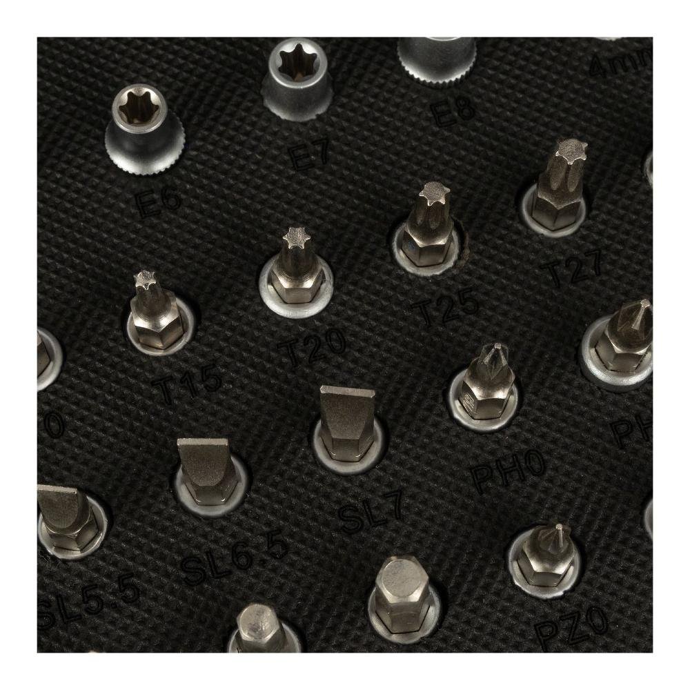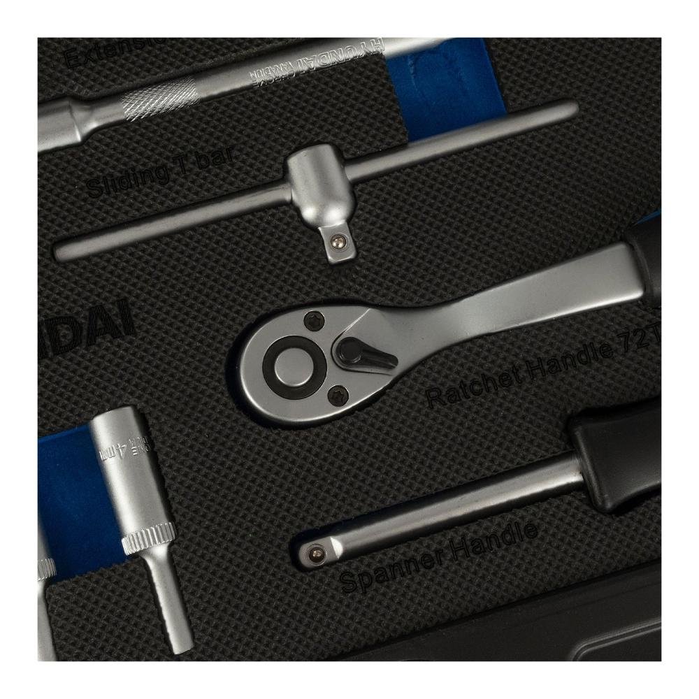 Include: 13 bussole (4-13 mm); 21 inserti bussola (Tx,Tg,Ph,Pz,He); 7 bussole lunghe (4-10 mm); Cricchetto; prolunghe, adattatori e snodo