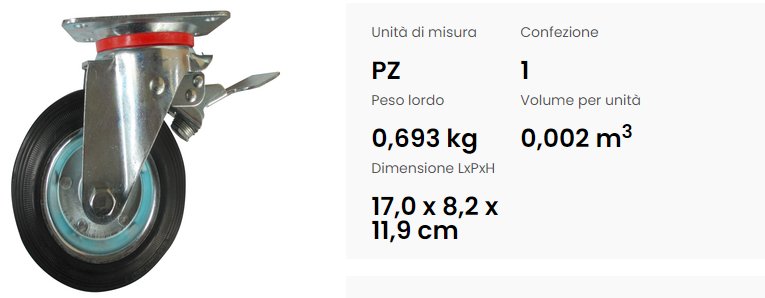 Nome:  RUOTA INDUSTRIALE D.85MM CON PIASTRA GIREVOLE(100X80) CON FRENO PESO MAX 50KG