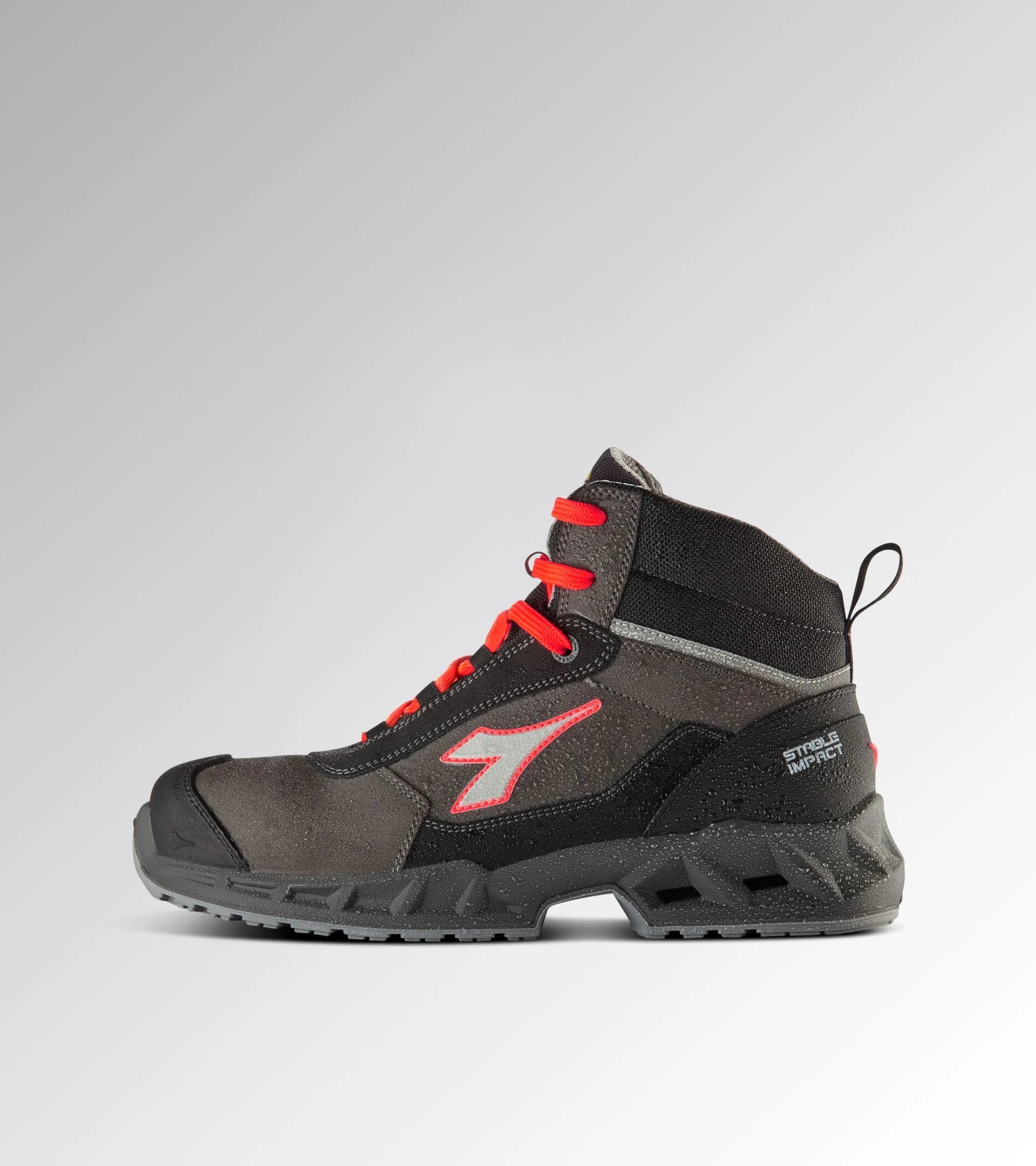 Calzatura di sicurezza alta S3 in pelle crosta, idrorepellente con tecnologia di ammortizzazione Stable Impact System. Puntale in alluminio 200J. Calzata 11. Fodera Air Mesh tridimensionale in 100% poliestere con antiscalzante in microfibra, K-SOLE, plantare in PU foam estraibile, traspirante e con carboni attivi. ESD. Protezione della punta e del tallone in TPU.