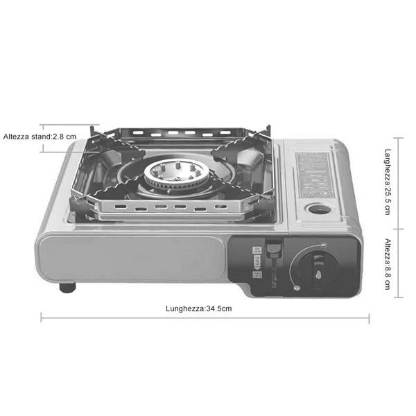 Presenta una leccarda con supporto, una manopola per il controllo del gas e una finestra di controllo della bomboletta.