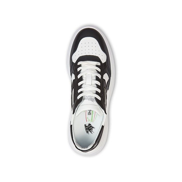 Tomaia in morbida pelle bianca e riporti in microfibra neri