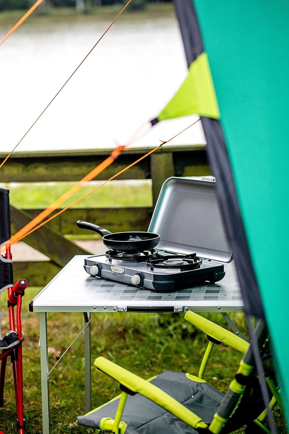 Fornello Campingaz a 2 fuochi con supporti pentola, leggero e facilmente trasportabile. Impugnature laterali integrate. Coperchio in acciaio smaltato. Presenta, inoltre, pannelli laterali resistenti al calore con supporti in acciaio smaltato che fungono anche da paravento. Potenza 2 x 2000 W. Accensione manuale. Manopole per un controllo completo della fiamma. Alimentazione propano o butano. Pu supportare due pentole 24 cm. Dimensioni 51,5 x 37,5 x 45,5 cm. Peso 3,5 kg