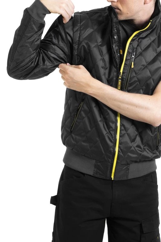 Giubbotto bomber fit 2in1. Possibilità di convertire in gilet smanicato con una zip nascosta.Trapuntatura a rombi, collo in piedi, polsini e fondo in costina. Tasche con zip nel fianco e su torace sx e tasca porta telefono applicata su manica sx. Zip frontale bicolore giallo+nero e tiretto in gomma personalizzato. Piping effetto riflettente inseriti nel taglio delle spalle e della manica dietro. Rinforzi gomito in canvas robusto stile cordura a contrasto. Personalizzazione stampa su antivento della zip. 100% poliestere – 311 gsm.